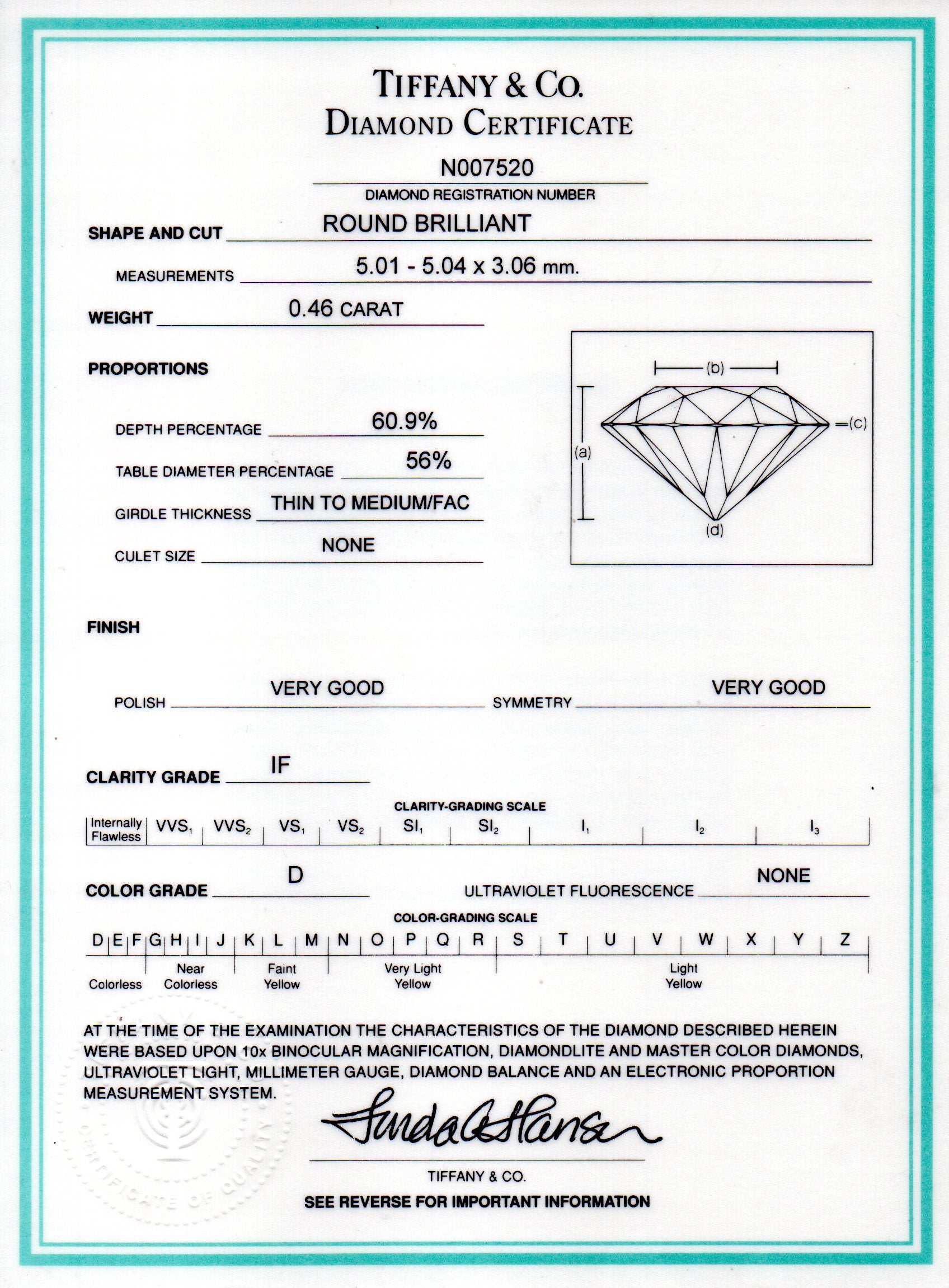 Tiffany & Co. Diamond Engagement Ring in Platinum D IF 0.46 CTW