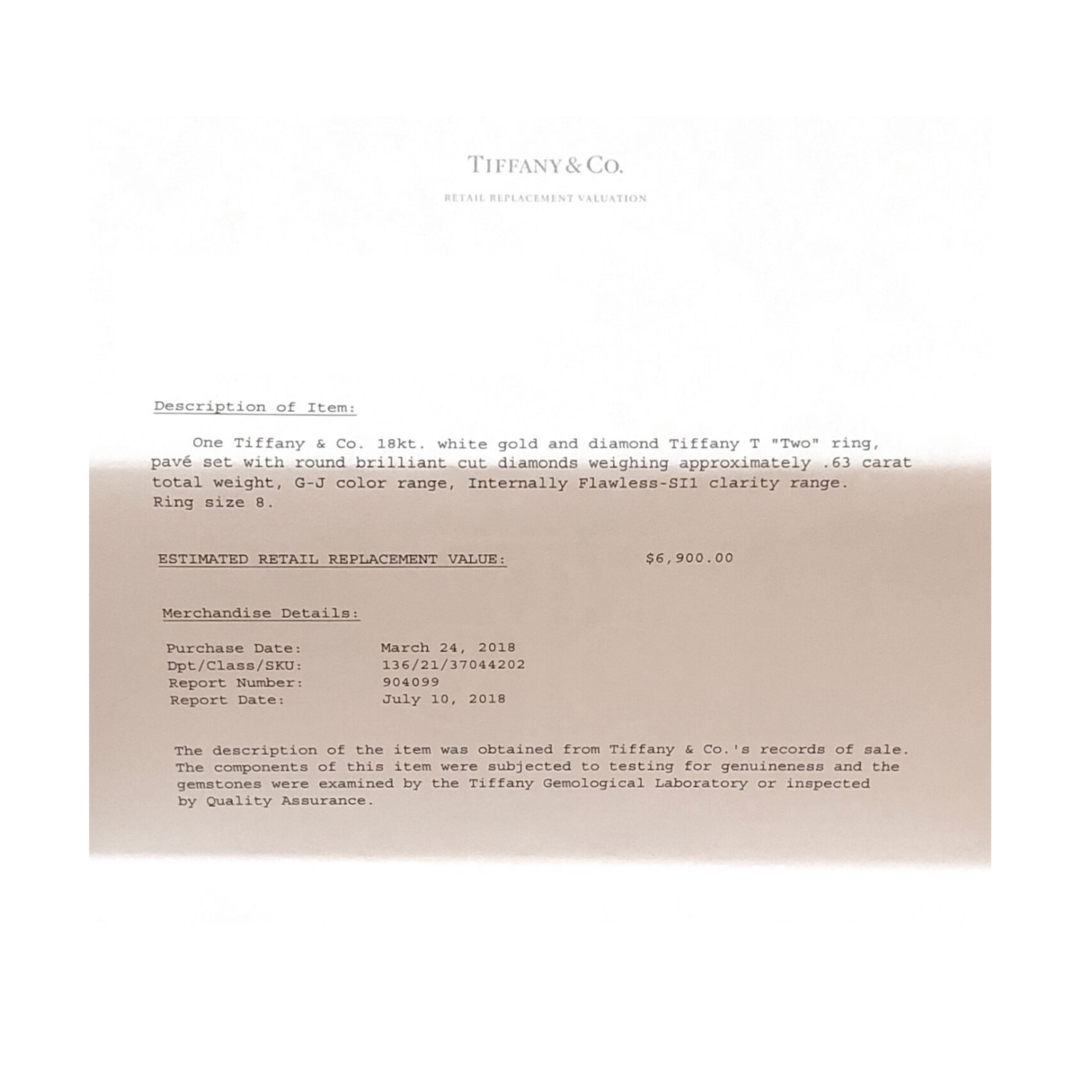 Inspired by the ‘T’ motif that Tiffany has been incorporating since the ’80s, the T collection is both striking and classic at once. Retails for 4300 USD. In excellent condition and recently polished. Ring size is 8.5. Comes with Box;Appraisal; Comes with the original box. (Out of stock)