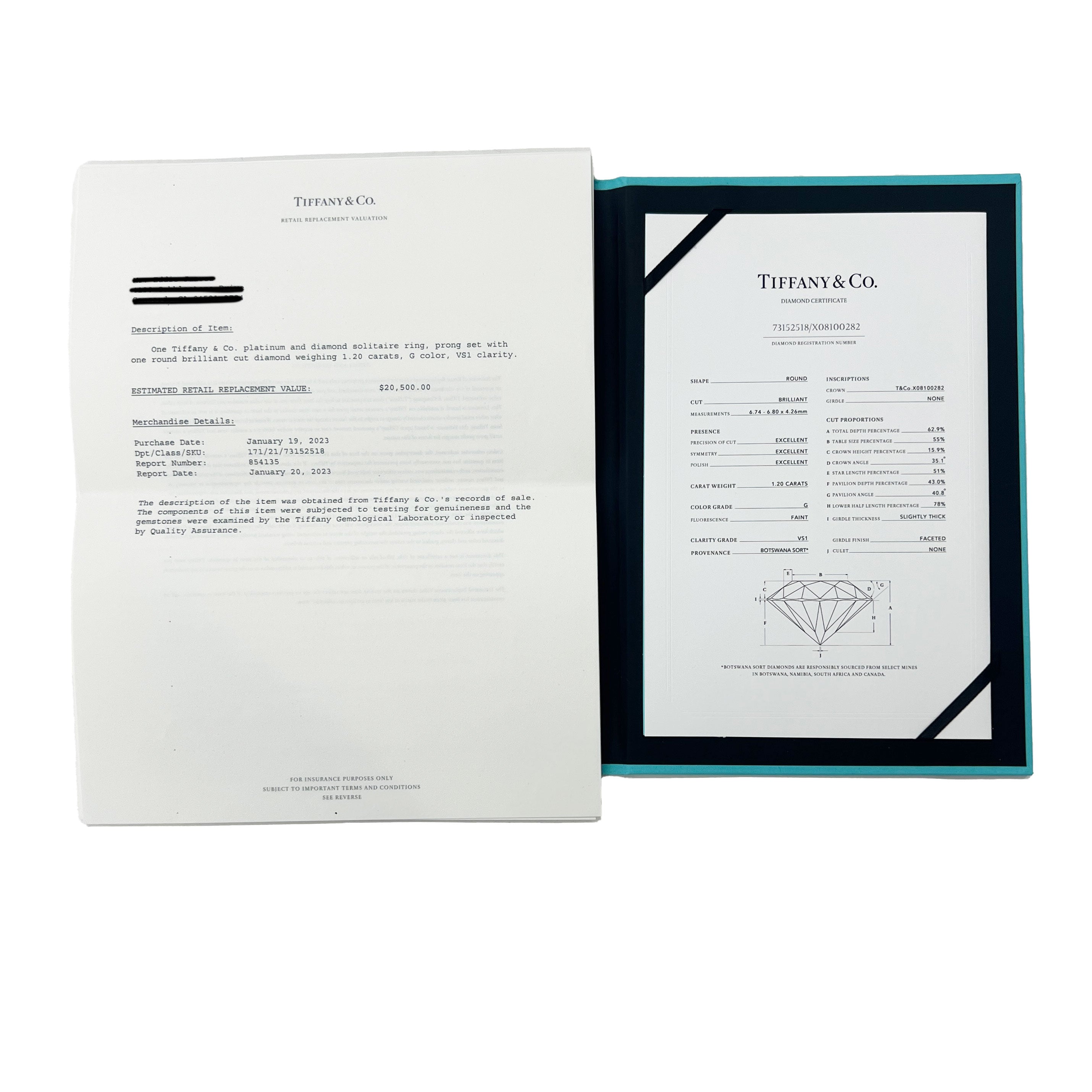 | Includes: Valuation Report;Tiffany Diamond Certificate | Main Stone Shape: Round Brilliant |